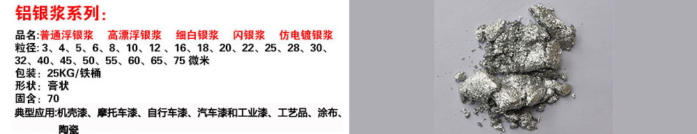 鋁銀漿 英文名:Aluminiumpaste 別名:鋁粉漿;閃光漿;銀漿 鋁銀漿產品,別名:鋁粉漿;閃光漿;銀漿,是一種不可缺少的金屬顏料...